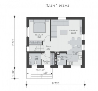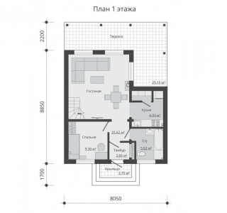 На входе расположена просторная прямоугольная прихожая, внутри которой можно установить мебель для хранения вещей. Далее идёт кухня-гостиная на 19 м2 с лестницей на 2 этаж.