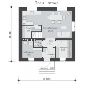 Основной вход в дом оборудован невысоким открытым крыльцом. Свободное место можно использовать для летнего отдыха на свежем воздухе. Через него попадаешь в небольшой холл, в котором располагается г-образная лестница. Под ней можно оборудовать удобную кладовую или гардероб.