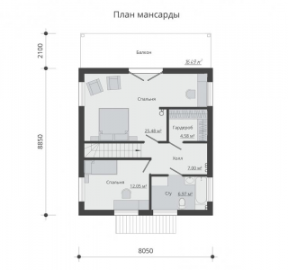 Этот проект занимает небольшую площадь. Рассчитан на проживание 2-3 человек, несмотря на наличие второго мансардного этажа.