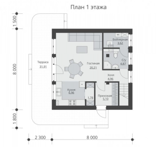 Удачно составлена планировка первого этажа. Вход располагается справа от эркера и имеет достаточно просторное и удобное крыльцо.