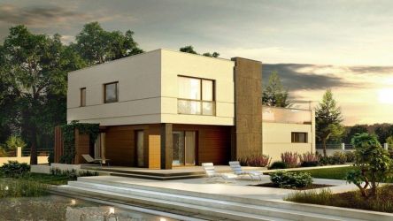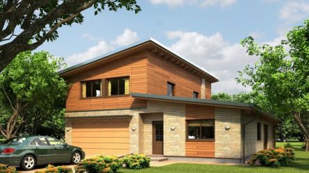 На готовом проекте видна небольшая терраса и крытая площадка для автомобиля, от которой можно и отказаться. Кровля строения состоит из трех частей, находящихся на разных уровнях.