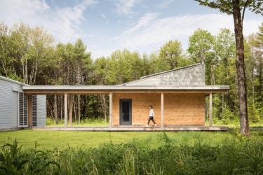 Вход в строение расположен по центру, но не точно, а с небольшим смещением, чтобы можно было сделать основную спальню больше. Благодаря такому положению двери, появилось одно центральное помещение, из которого можно пройти в разные части дома, не делая их полностью смежными.