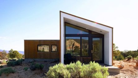 Второй проект представляет одноэтажный дом с односкатной крышей. Строение универсальное, так как возвести его можно из разных материалов (СИП панелей, в виде каркаса обшитого досками, различных блоков, например, газобетонных).
