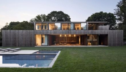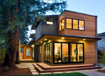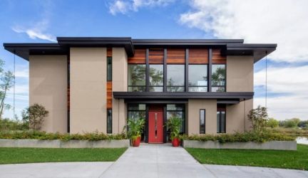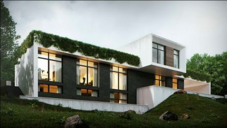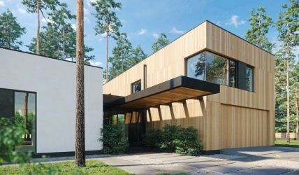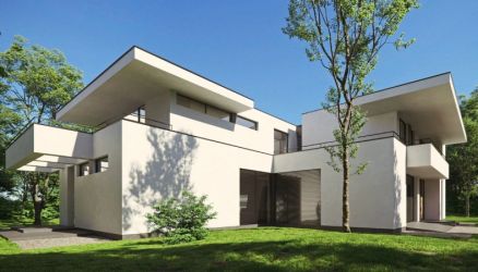 Сказывается это и на подборе варианта отделки фасада, которая, если это дом хай-тек с плоской крышей, просто не может выполняться с помощью дешёвого пластика, вагонки, профлиста, и т.п. Если уж используется погонажный материал, то планкен (термообработанная доска без профилирования поверхности), если уж модули, то в виде металлических и ламинированных кассет. Хорошо выглядит штукатурка, без применения декора классической архитектуры.