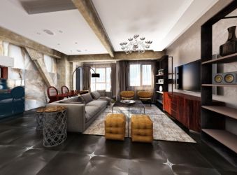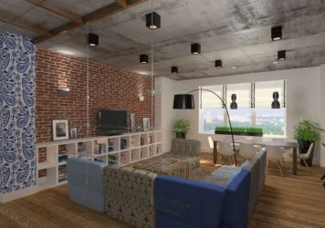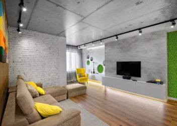 Минималистический дизайн, который использовался при проектировании фасада, нравится далеко не каждому. В этом случае можно использовать эклектичные сочетания нескольких стилей. При желании, получится даже эмитировать бетон, хоть перекрытие здесь и не бетонное, а балочное. Просто для того, чтобы выполнить имитацию, потолок нужно обшить гипсокартоном.