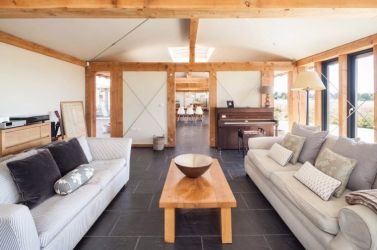 • На первом этаже жилого блока – большая гостиная с камином и двумя выходами на террасу, наполовину изолированная кухня и гостевой туалет.
