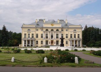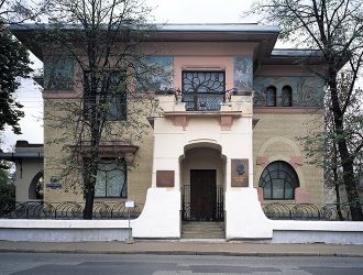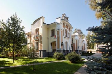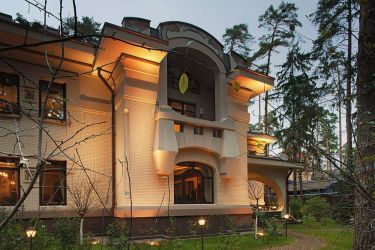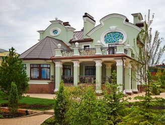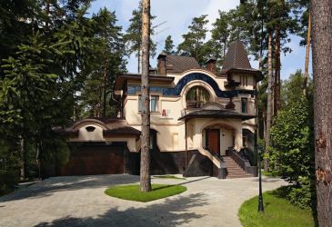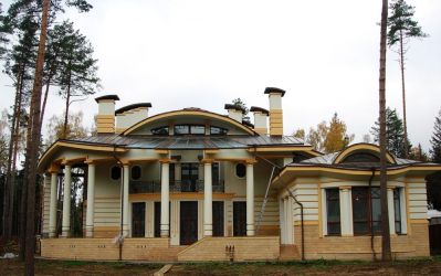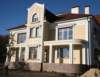 - На фасаде строения обязательно должна присутствовать объемная лепнина — она обрамляет оконные проемы, украшает центральные части композиции, дымоходы и т.п. Это и барельефы, и медальоны, и арки и даже мезонин.