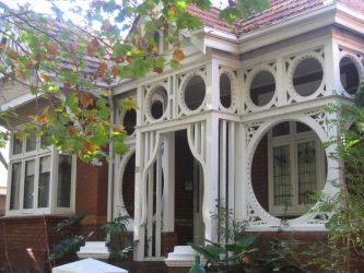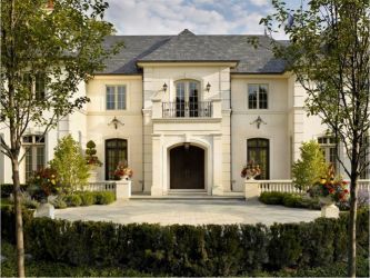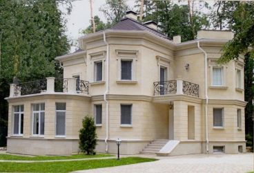 - Фасад обязательно должен быть каменным, кирпичным или покрытым слоем штукатурки. Все декоративные детали делаются из бетона. Исключение составляет ковка, которая разбавляет общий вид, будучи установленной на ограждения балкона и крыльца.