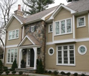 - Фасад красится в пастельные тона желто-коричневого оттенка. Может быть и розовый цвет, но он также делается больше похожим на коричневый. Очень распространен белый оттенок – в него могут быть выкрашены основные части фасада или декоративные детали для контраста.