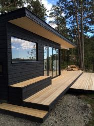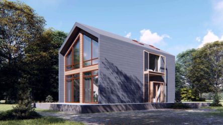 А этот домик больше похож на сказочный, из-за своих скромных размеров. Подобное решение подойдет для использования на загородном участке для отдыха. На фасаде использованы уже привычные большие окна.