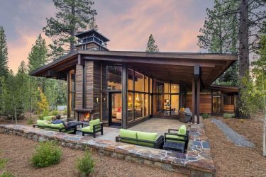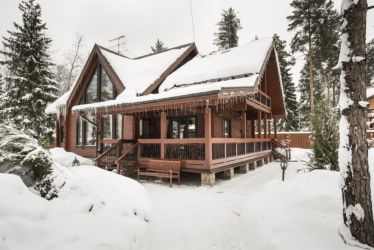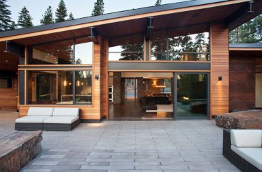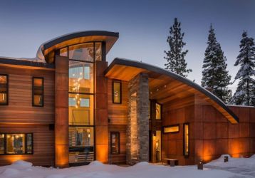 За счёт клееного бруса на фасаде установлено массивное остекление. Смотрится дом очень выразительно. Такой стиль можно применять как в горных районах, так и средних широтах с лиственными деревьями в округе.