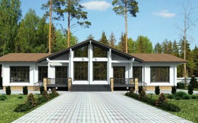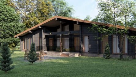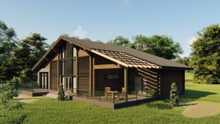 Коробка дома сложена из клееного бруса, который сочетается с массивным остеклением. Со стороны входа находится просторная крытая терраса. У дома двухскатная крыша.