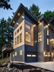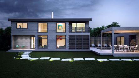 Представленный ниже дом с односкатной крышей и полноценными двумя этажами, который построен в стиле современного минимализма.