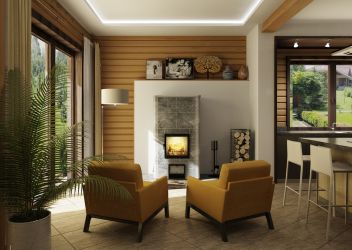 Прямиком с террасы попадаешь просторную гостиную, в середине которой есть камин (другие проекты домов с камином представлены в статье). Отсюда есть проход в гардероб.