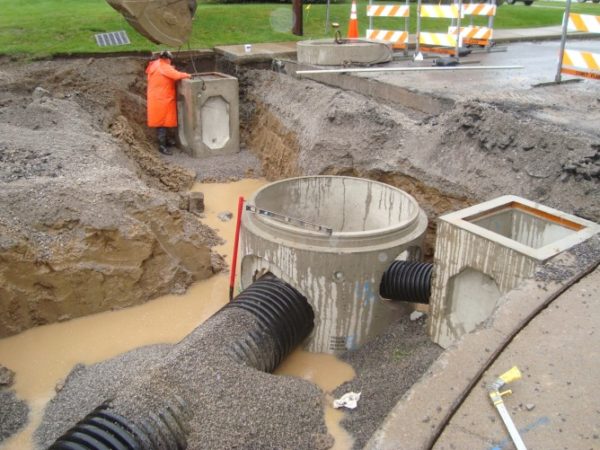 При организации поверхностного отвода стоков, важно провести мероприятия, которые не позволят размыть грунт. Например, дно траншеи выкладывается камнем или бетонными плитами (лотками), а в местах сброса вод может быть устроен колодец, в котором будет гаситься скорость потока.
