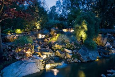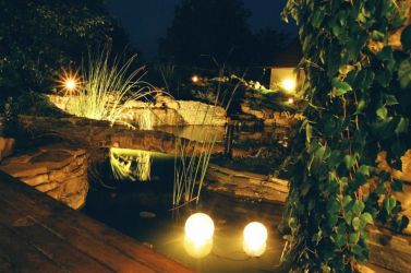 - Прожекторы – самый распространенный вид осветительного оборудования для прудов. Устанавливаются они как под водой, так и на суше. Для прожекторов характерно испускание узконаправленного светового луча, поэтому их используют для точечной подсветки объектов. Находясь под водой, они могут создавать столбы света, выходящие из ее толщи – очень красиво и эффектно. Прожекторы часто применяют попарно, скрещивая световые потоки, что позволяет избавиться от некрасивых и слишком контрастных теней, а также придать больше объема. Прожекторы могут быть замаскированы в искусственных камнях, что при выключении делает их совершенно невидимыми.