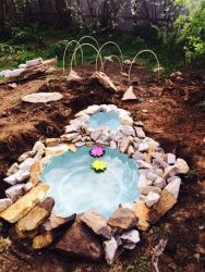 - На этом фото показан небольшой бассейн, который по назначению приравнивается к садовому пруду. Любой искусственный водоем декоративного назначения украшается камнем, если автор старается придать ему натуральный облик. Здесь пошли самым простым путем – резина просто обложена галькой, держащейся на цементном растворе.